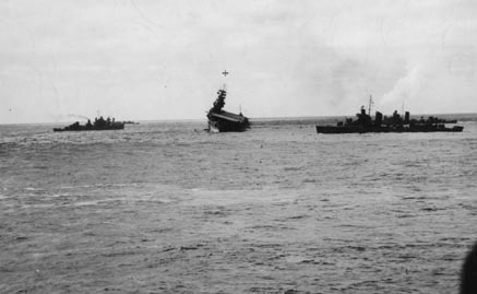 | 6. | Stern view of U.S.S. YORKTOWN at time of abandoning (4 June 1942). |